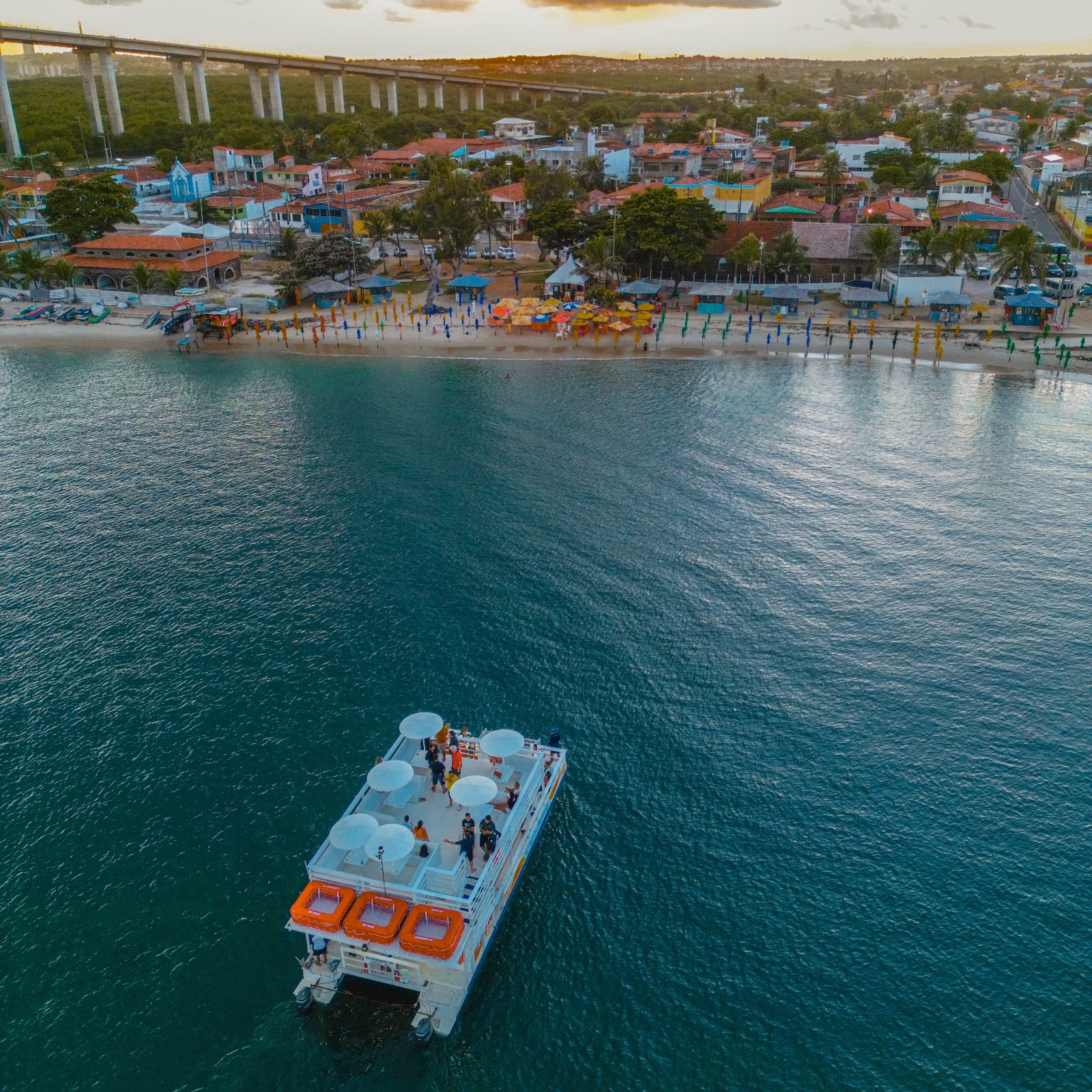 A estrutura do catamarã foi pensada para oferecer o máximo de conforto aos passageiros. Com um deck superior, banheiro e bar com coquetéis deliciosos, você terá tudo o que precisa para desfrutar ao máximo dessa aventura.